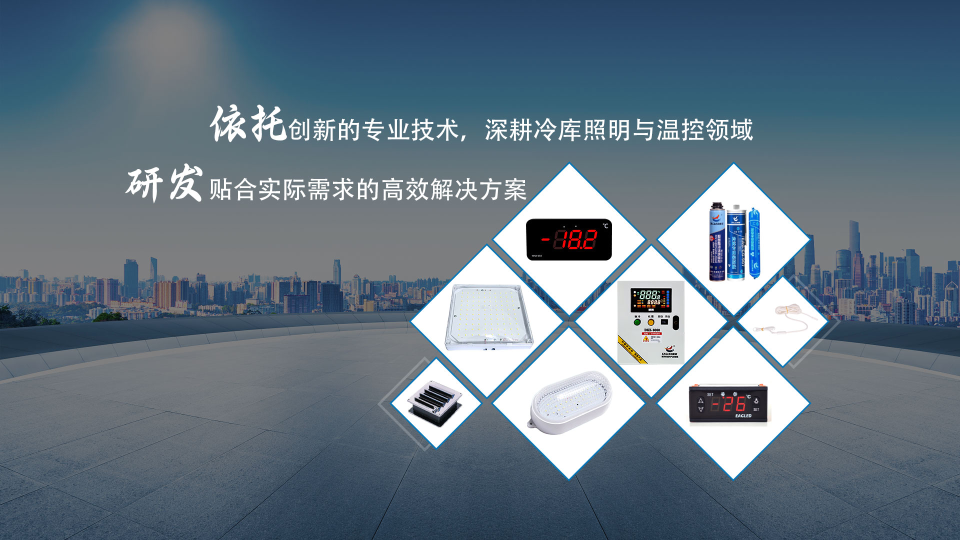?EAGLED鷹格現如今可以提供給冷凍冷藏客戶更多標準和非標準的溫(濕)度控制和照明解決方案,可以提供給客戶更多性能杰出,可信賴并且不斷革新的冷凍冷藏環境控制和照明系列產品